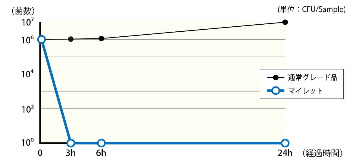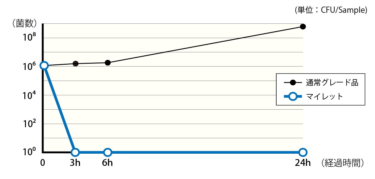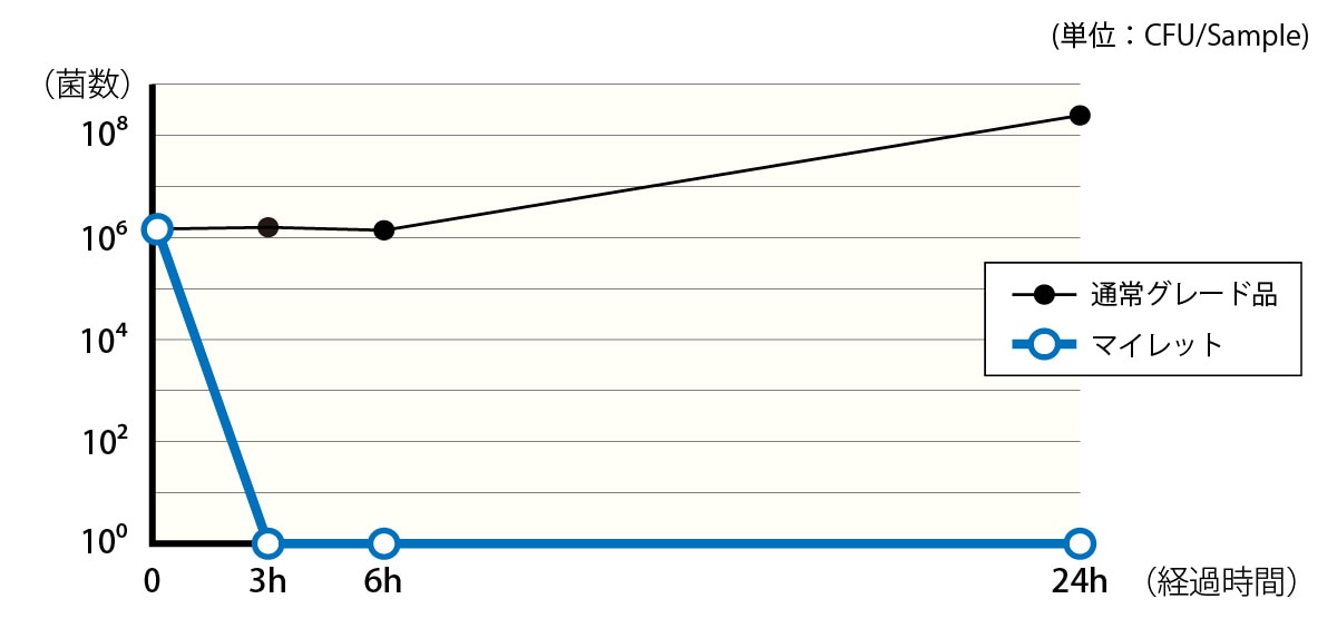 試験結果:使用1時間後、24時間後ともに生菌数は、ほぼゼロという結果でした。 -