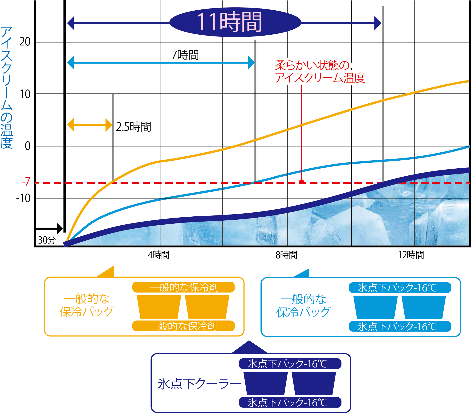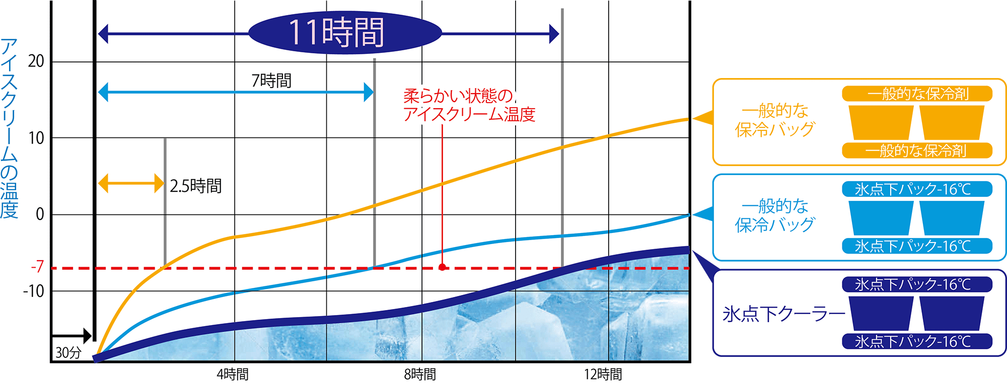 室温33℃の場所にて『氷点下クーラー』の内部にカップアイスを2枚の『氷点下パック』でサンドイッチ状にセットし、アイスのカップ縁部分(溶けやすい部分)の温度を測定。一般的な「保冷バッグ&保冷剤」では2.5時間でアイスクリームが溶け始めたのに比べ、『氷点下クーラー&氷点下パック』は11時間アイスクリームを保存できました。
