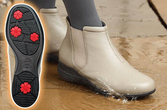雨から守る!悪天候に強い撥水加工/安心設計の特殊な靴底