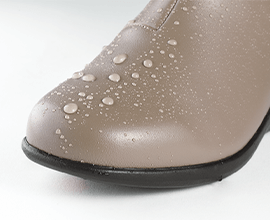 悪天候でも安心して気持ちよく歩けるよう、レザー部分に水をはじく加工が施されています。突然の雨や雪でも足首までしっかりガード。足が濡れず冷える心配がありません。※生地に撥水加工をしておりますが、完全防水ではありません。