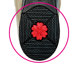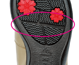 ▲摩擦力の強いゴム素材や花模様の滑り止めもついた特殊な靴底。雨道でも安全な歩行をサポートします。