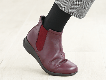 外反母趾の方も締めつけ感なく履くことができる“5E”サイズを採用!特別な足型から作られ、親指の付け根部分を膨らませた設計で、甲高・幅広の方にもゆったりと履いていただけます。厚手のタイツの日でも履き心地楽ラク!見た目はきちんと、中はゆったりなブーツです。