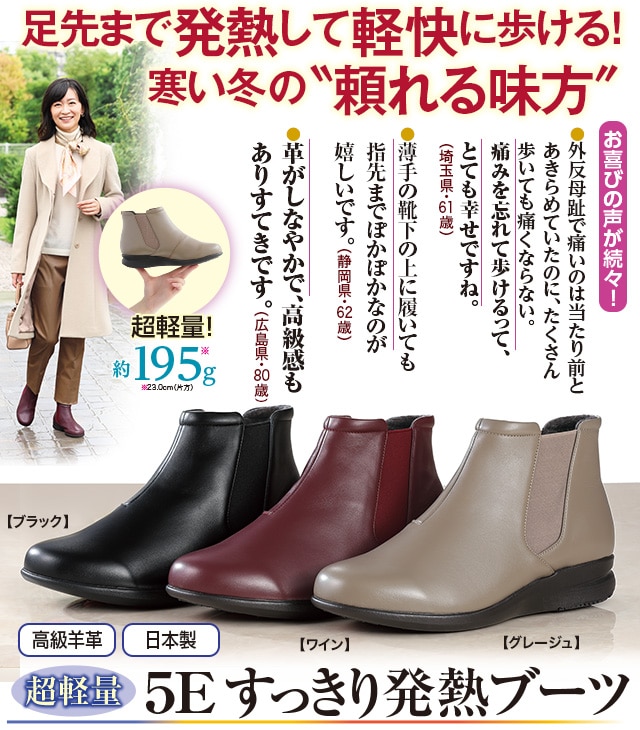 冬は寒くて外出がおっくう…と思ったことはありませんか?そこで当社では、あなたの足を暖かく包み込む、冬のお出かけにぴったりのエレガントシューズを開発しました。発熱する特殊素材を使用して、冷えがちな指先から足首までしっかりカバー。さらにブーツとは思えないほど軽くて足に優しくフィットし、雨や雪でも晴れやかな気分で歩ける逸品です。楽ちんなのに足元がすっきり見えるから、旅行やおしゃれな場所でも大活躍。厳しい冬を過ごすための心強い味方として、ぜひおすすめいたします。