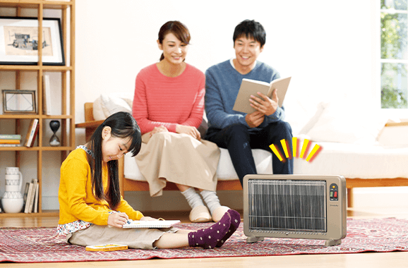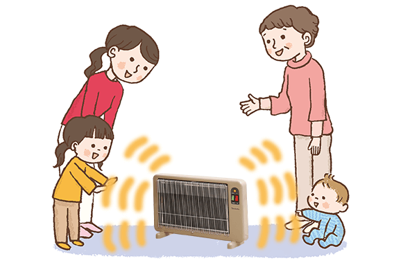 遠赤外線は太陽光にも含まれる体に優しい自然な波長。空気を暖めることなく、直接、体に熱を届けてくれるので、部屋の下の方に寒い空気が溜まったり、顔が火照ることもなく、足元から心地よく暖まります。まさに頭寒足熱を実現する健康暖房です。
