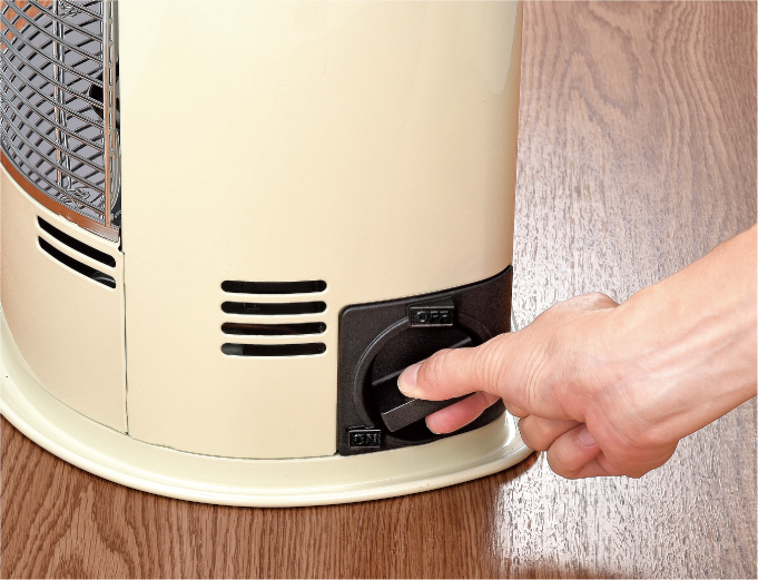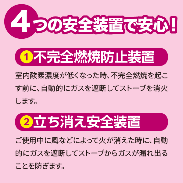 室内酸素濃度が低くなった時、不完全燃焼を起こす前に、自動的にガスを遮断してストーブを消火します。
