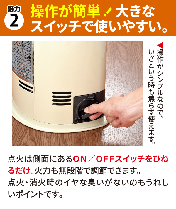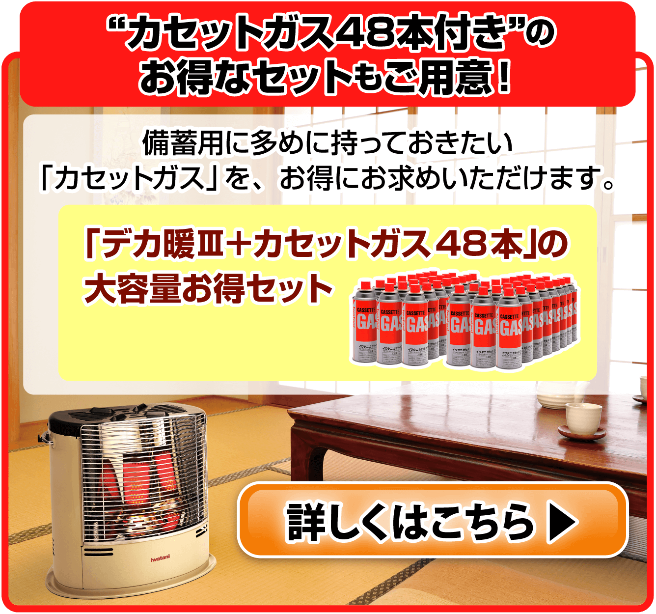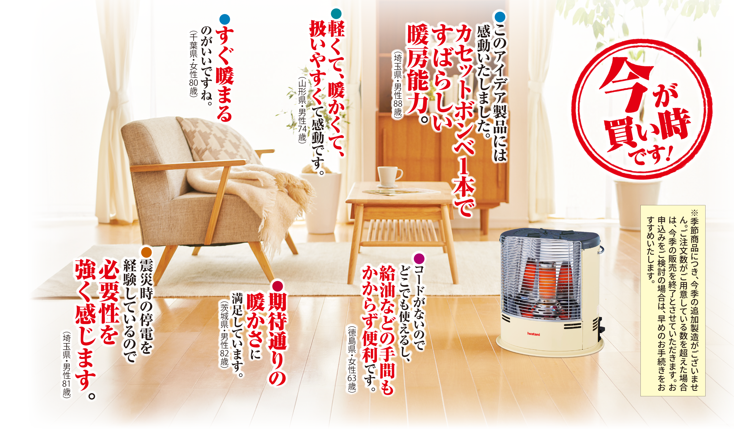 カセットボンベが燃料であれば、いざという時でもさまざまな場所で利用できるので非常に便利です。あなたの生活を支える暖房器具として役立ちますので、ぜひお使いいただけたら、うれしいです。