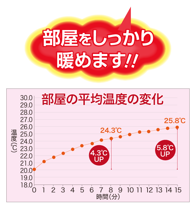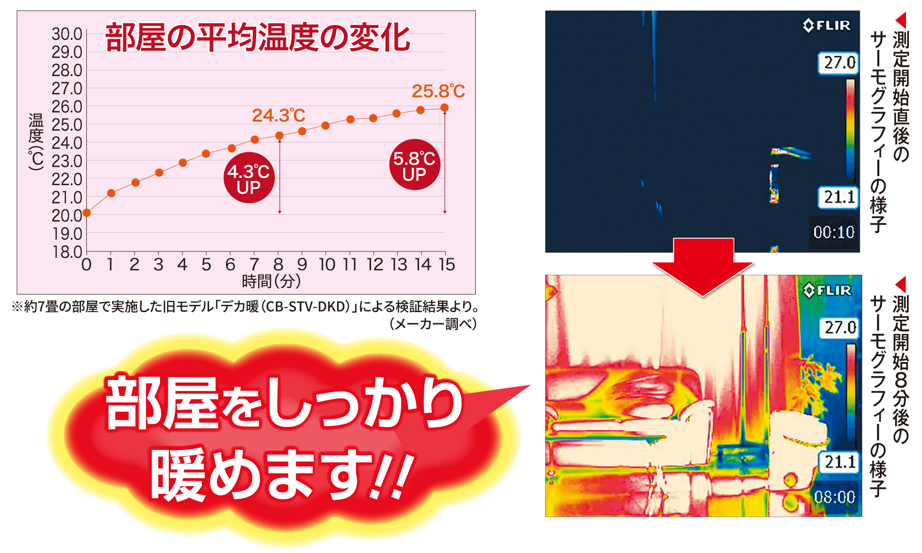 • ※約7畳の部屋で実施した旧モデル「デカ暖(CB-STV-DKD)」による検証結果より。