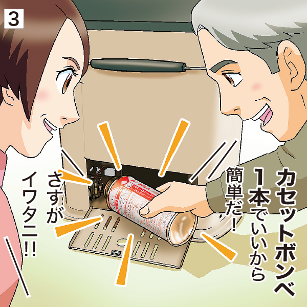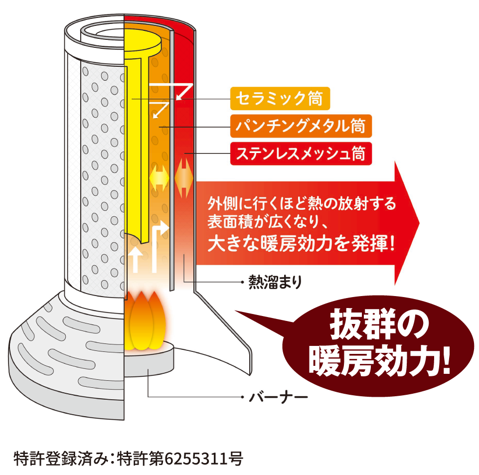 イワタニ独自の「熱溜め燃焼筒」により、カセットボンベ1本でも小型石油ストーブ並みの暖房効力があります。