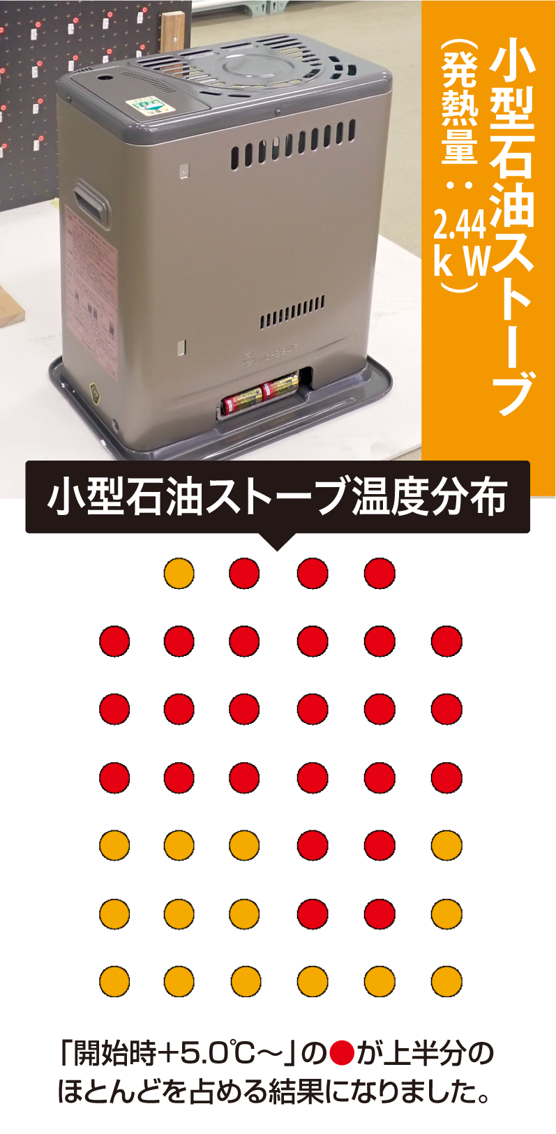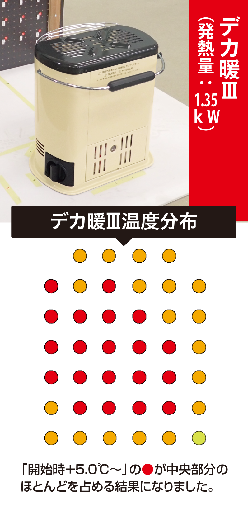 • 【結果】『デカ暖Ⅲ』と小型石油ストーブの暖かさはほぼ同等であることが確認されました。