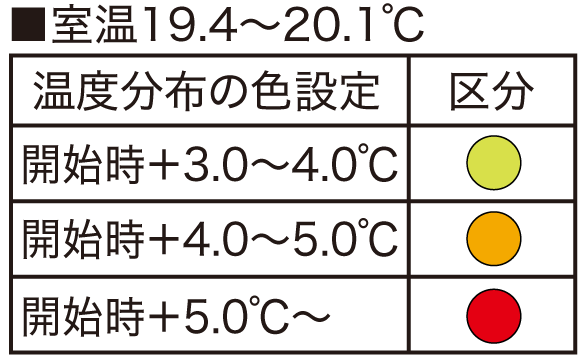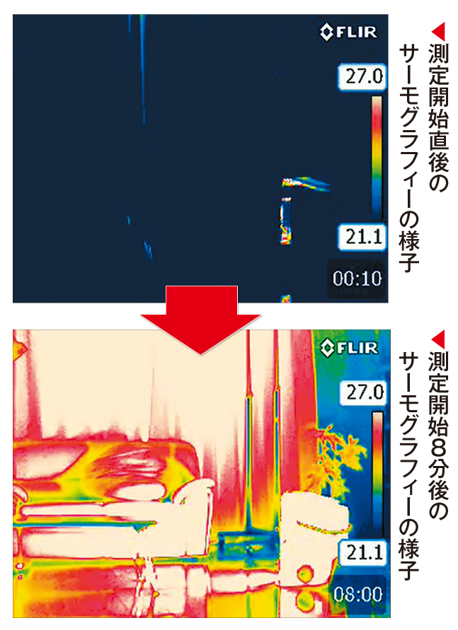 点火前に比べ、部屋の温度が8分で4.3℃、15分で5.8℃も上昇しました。サーモグラフィーで見ると、温度の変化は一目瞭然です。カセットボンベ1本で、部屋全体をしっかり暖められることを実証しました。