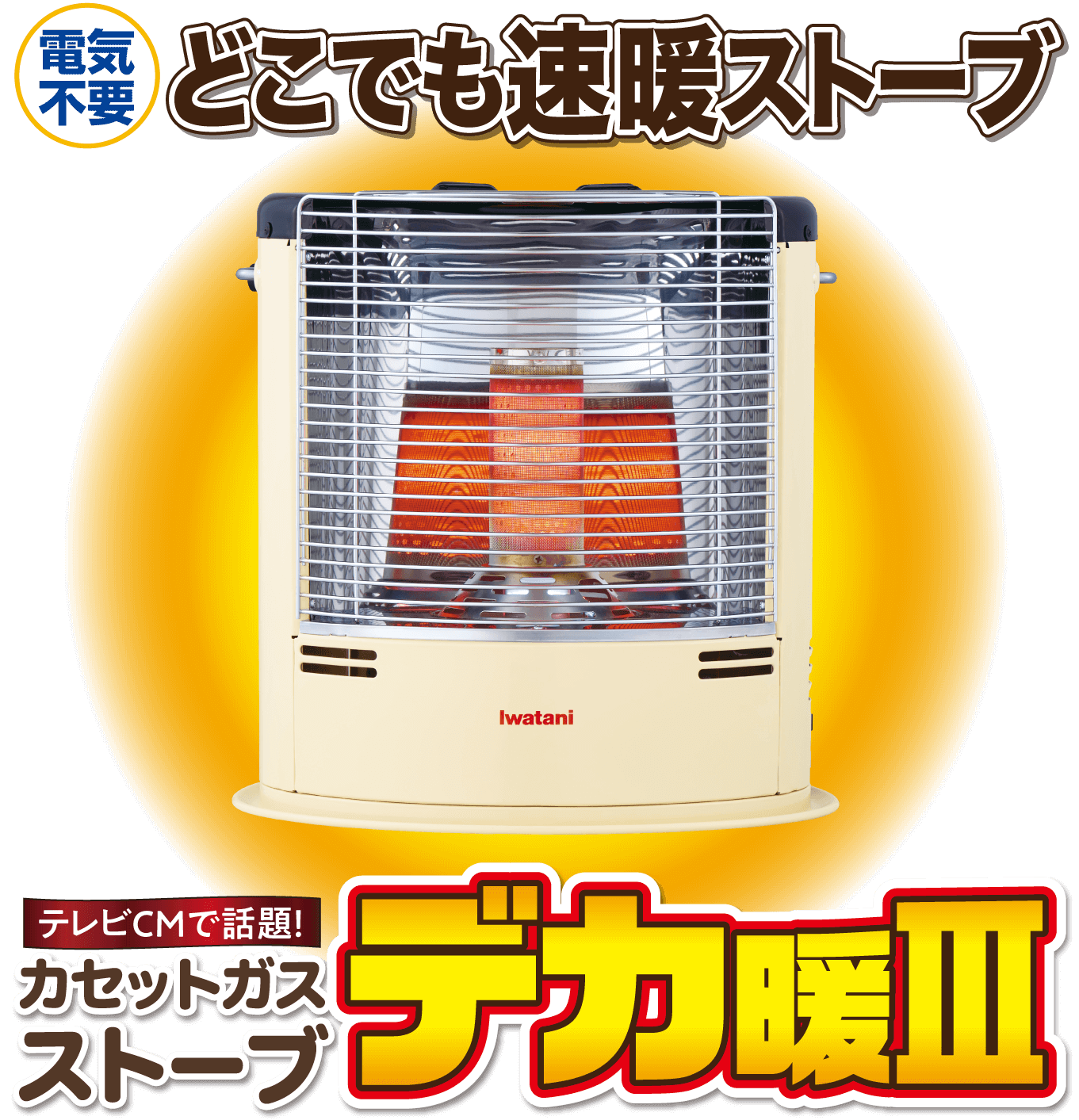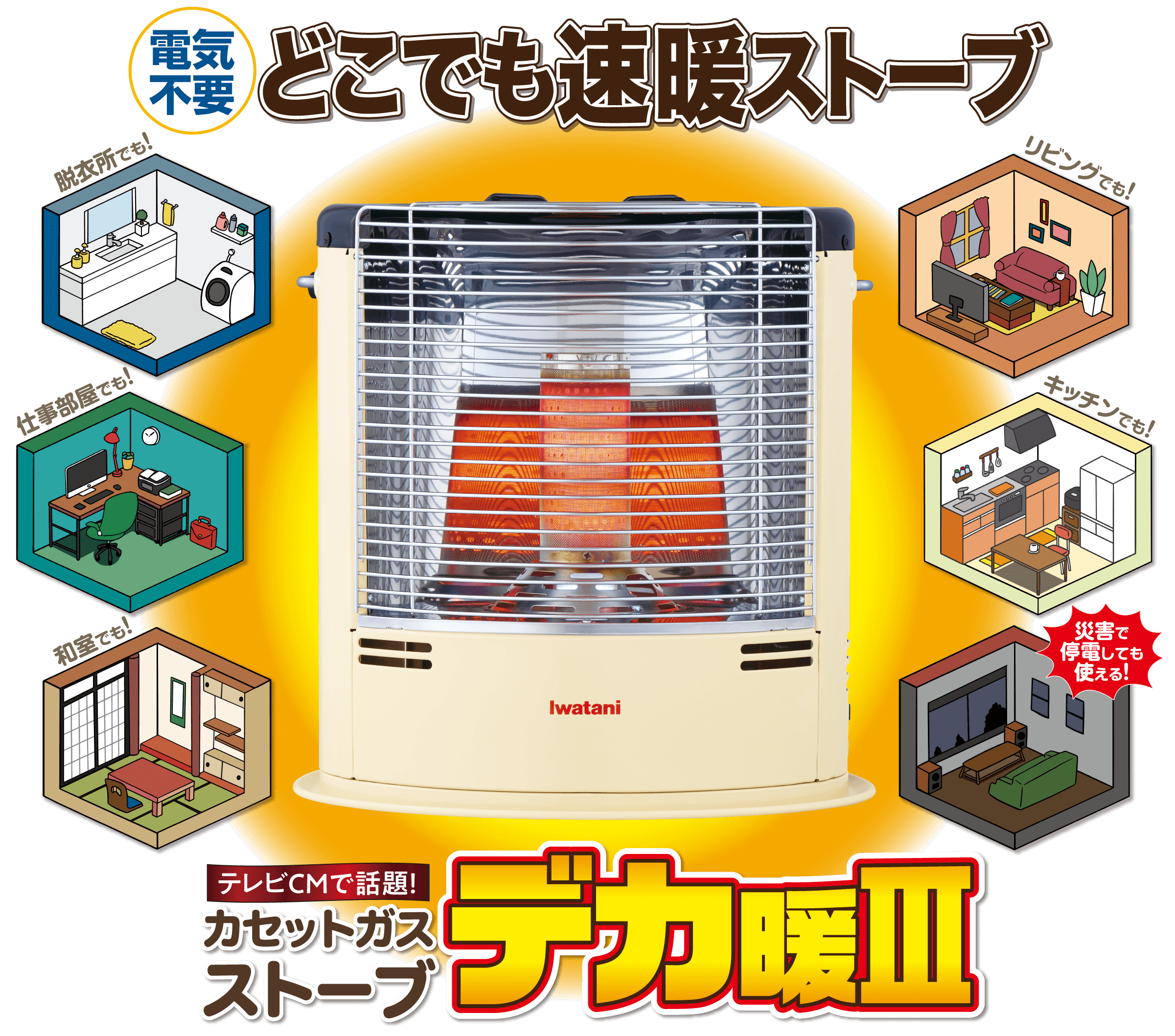 イワタニの『デカ暖Ⅲ』はコンセントやガス栓がなくても使えるコードレス暖房機。燃料はカセットボンベ1本だから、入手も交換も保管も簡単。電化製品が一切使えない停電時にも使えるうえ、すぐに暖かくなると大好評です。