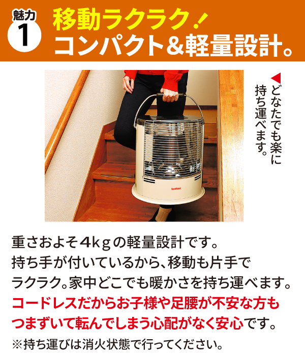 重さおよそ4kgの軽量設計です。持ち手が付いているから、移動も片手でラクラク。家中どこでも暖かさを持ち運べます。コードレスだからお子様や足腰が不安な方もつまずいて転んでしまう心配がなく安心です。