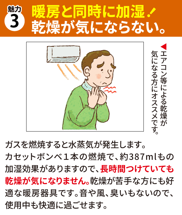 ガスを燃焼すると水蒸気が発生します。カセットボンベ1本の燃焼で、約387mlもの加湿効果がありますので、長時間つけていても乾燥が気になりません。乾燥が苦手な方にも好適な暖房器具です。