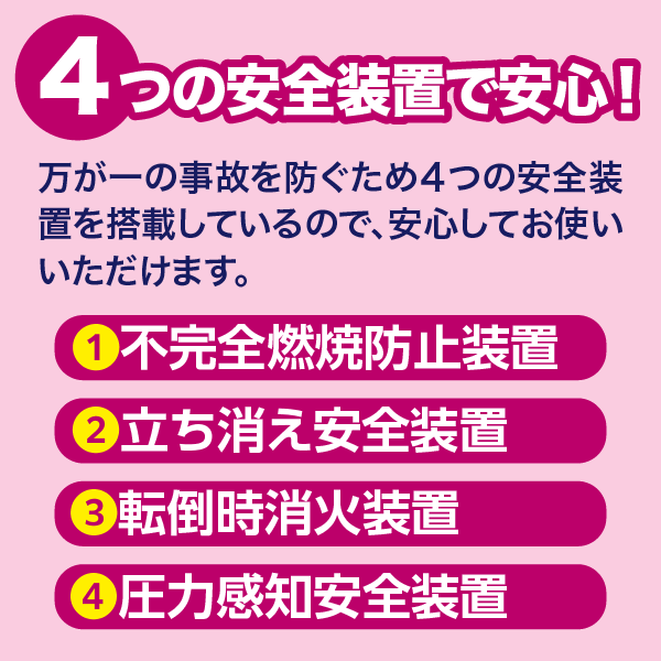 ご使用中に風などによって火が消えた時に、自動的にガスを遮断してストーブからガスが漏れ出ることを防ぎます。