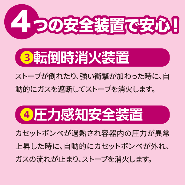 カセットボンベが過熱され容器内の圧力が異常上昇した時に、自動的にカセットボンベが外れ、ガスの流れが止まり、ストーブを消火します。