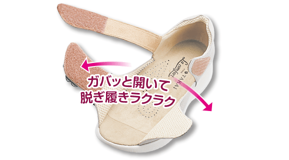 足を締めつけすぎない広々5Eサイズで外反母趾・幅広・甲高でお悩みの方も安心です。軽量設計で歩行もラクラク!