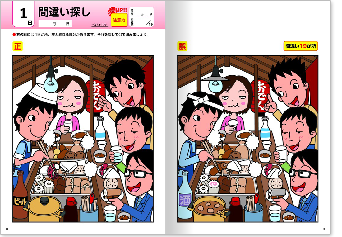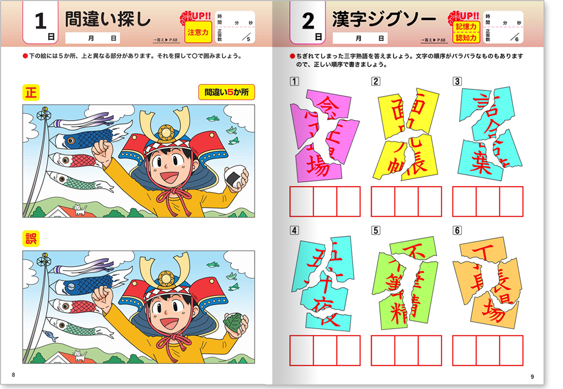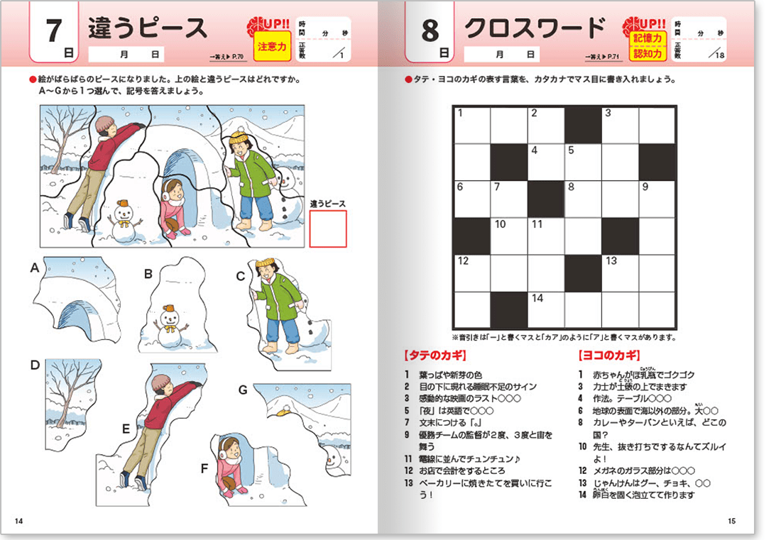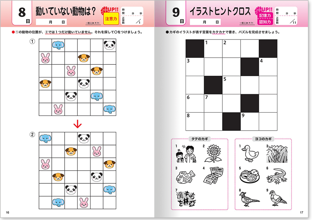 カラフルなイラストが楽しい「間違い探し」や「仲間はずれ探し」、クロスワードパズルやかんたんな計算問題、漢字の読み書きなど収録の問題は多種多様!