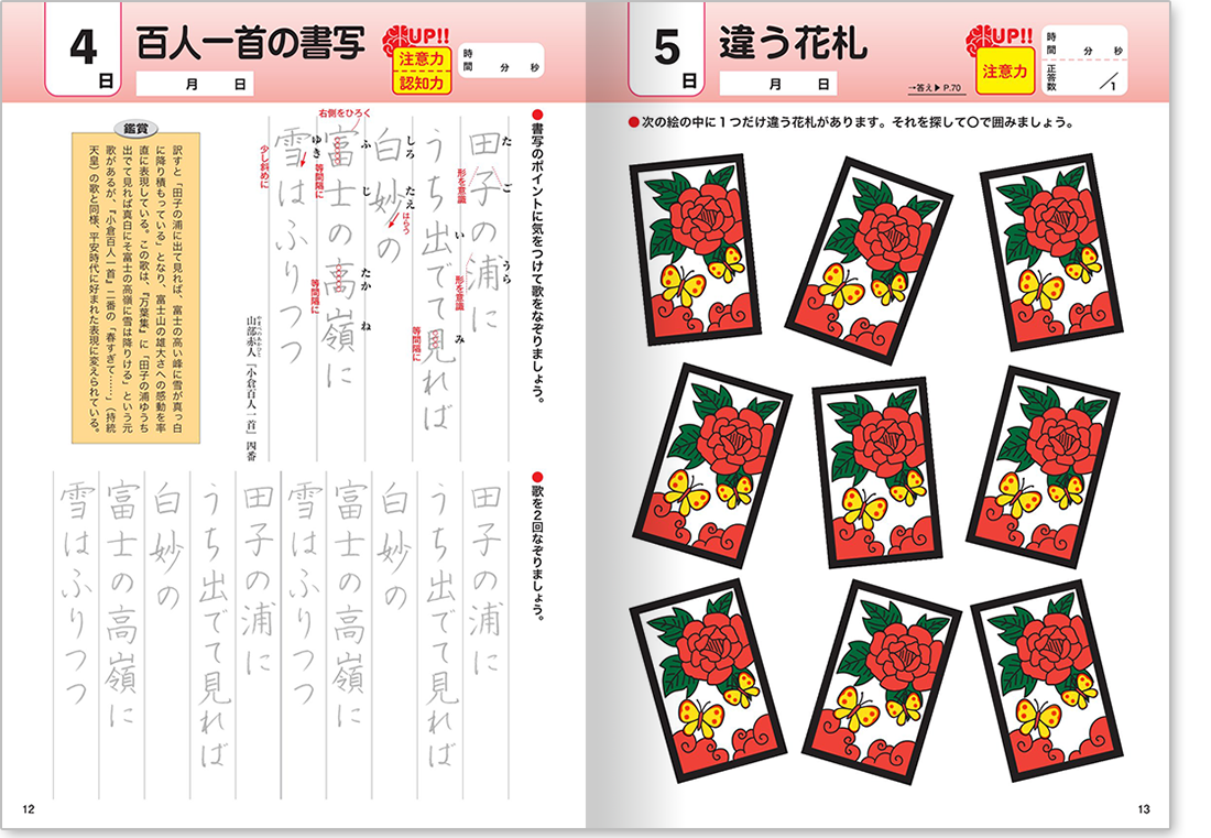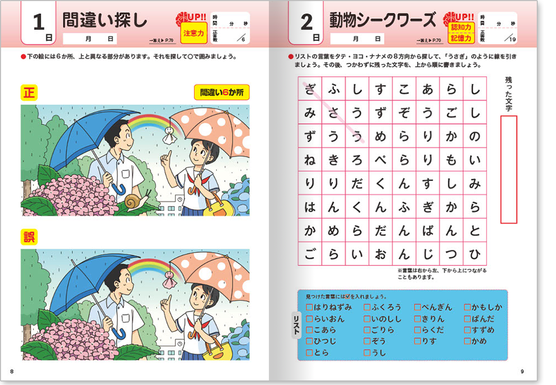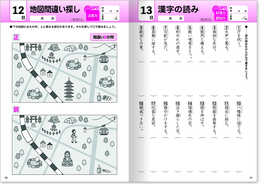 各問題ページには、どんな脳力を鍛えられるのか、「記憶力」「認知力」「情報処理」「注意力」のマークが記載されていますので、「この問題は〇〇力」に効くんだなと意識しながら集中してお取り組みいただけます。