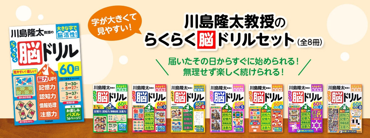 『学研 川島隆太教授のらくらく脳ドリル 8巻セット』は、脳トレの第一人者ともいえる東北大学・川島隆太教授監修の脳トレ書籍です。
