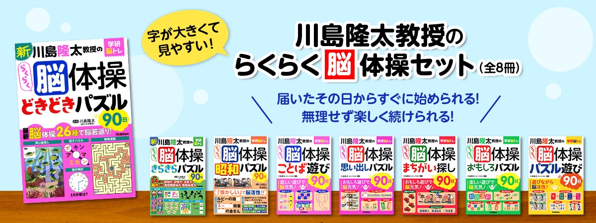 『学研 川島隆太教授のらくらく脳体操 8巻セット』は、脳トレの第一人者として知られる東北大学・川島隆太教授監修の脳トレ書籍です。