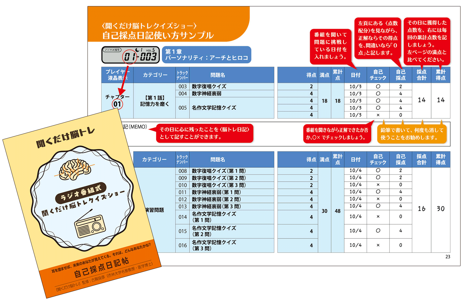- <ラジオのクイズ番組>形式で、脳トレ問題を出題。ラジオの参加者になったつもりで楽しく解答していくだけで、脳トレができます。