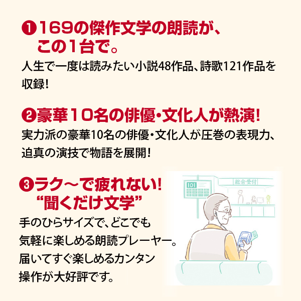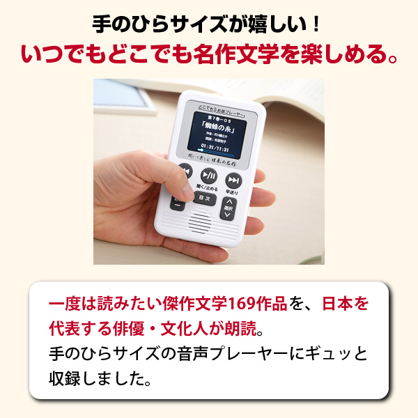 一度は読みたい傑作文学169作品を、日本を代表する名優が朗読。CD版で大好評だった珠玉の語りを、手のひらサイズの音声プレーヤーにギュッと収録しました。