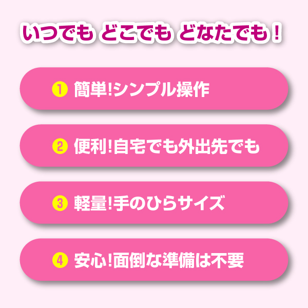 重さはわずか約162g(※電池込み)。ポケットやカバンに入れれば、どこへでも持ち運べます。面倒な設定や配線、インターネット接続は不要です。どなたでも安心してお楽しみになれます。