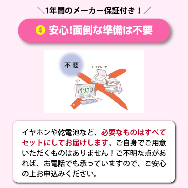 イヤホンや乾電池、アダプターなど、必要なものは全部セットしてお届けします。ご自身でご用意いただくものは何もありません。もちろん1年間のメーカー保証付き。ご不明な点があれば、お電話でも承っていますので、ご安心の上お申込みください。