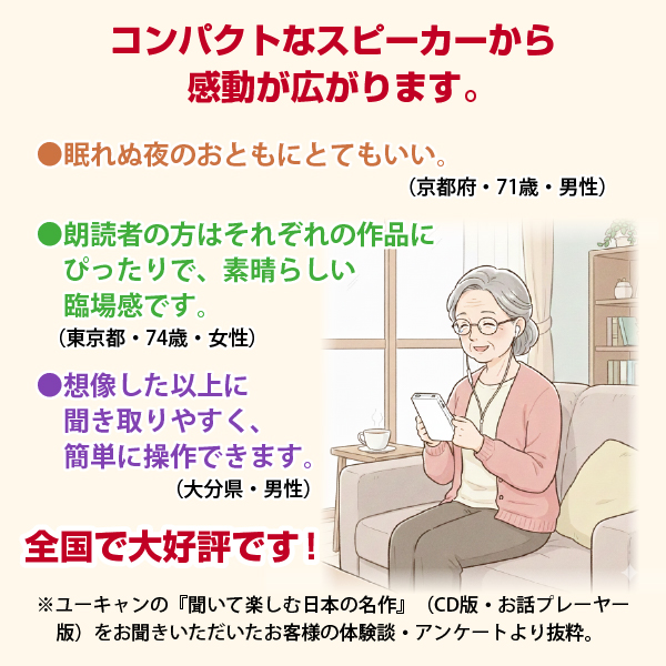 朗読者の皆さんも個性があって、作品にぴったりで、心の癒しを感じます。素晴らしい臨場感にあふれていて、これからの道しるべを得られました。時には友達のような感覚で、辛い時や楽しい時に『聞いて楽しむ日本の名作』が傍にあります。 (東京都・74歳・女性)