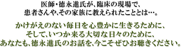 数多くの患者さんと、そのご家族を見守ってきた徳永進氏のお話は、あたたかく、ときに涙があふれるほど感動的です。いのちの大切さをあらためて感じることができる、徳永進氏の講話CD全集をぜひお聴きください。