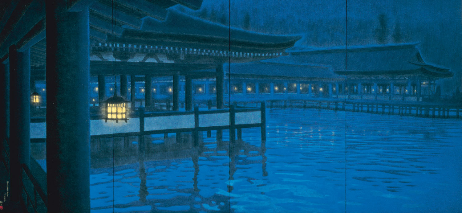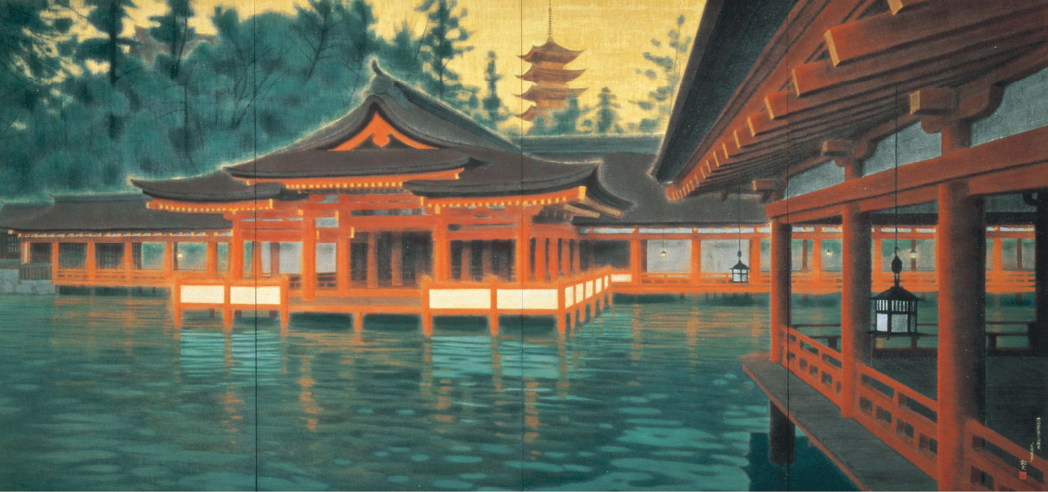 故郷に近い嚴島神社に格別の愛着を抱いていた画伯。朝の光の中、朱の神殿が水に映る姿は、この世のものとは思えぬほどに美しい。この作品はその瞬間を見事に描ききっている。