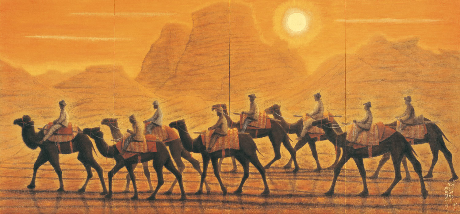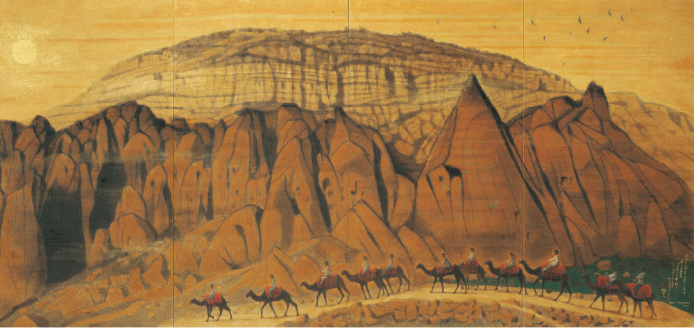 東西の文化や物資は絲綢之路を往き来するキャラバン(隊商)によって運ばれた。天空から降り注ぐ光は、旅の安全を祈る慈光として描かれている。
