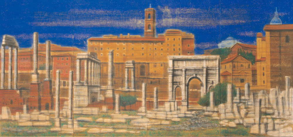 古代ローマ帝国において、政治と宗教の中心であったフォロ・ロマーノ(=ローマ人の広場)。すべての道はローマに通じる、と言われるようにシルクロードの西の終点を象徴する地として、この作品は描かれている。