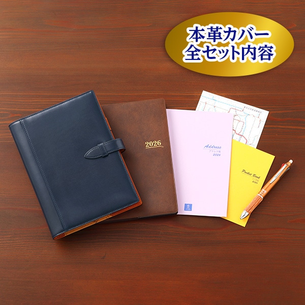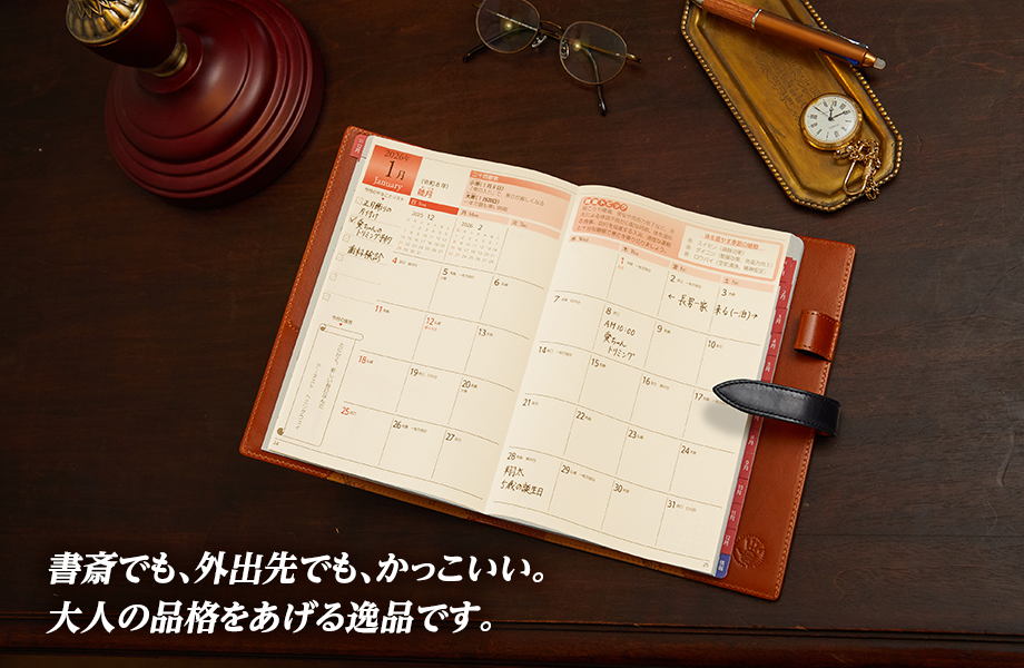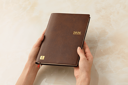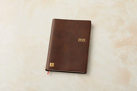 毎年ご好評いただいている温かみと高級感を併せ持つブラウンの合皮カバーも付属しています。その日の気分によってカバーを付け替えたり、お出かけ用とご自宅用で分けたり・・・。2026年の刻印つきなので、ご使用後にご自宅でご愛蔵いただく際にもおすすめです。
