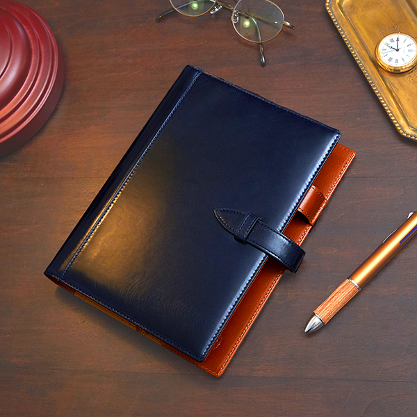 革鞣しの本場・イタリアのトスカーナ地方の工房で鞣された貴重なイタリアンレザー(牛革)を贅沢に使用。艶と透明感のあるネイビーカラーは、知的で上品な雰囲気を演出してくれます。