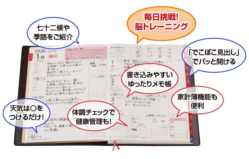 月間・週間カレンダーに加え、心に響く金言、目からウロコの健康コラム、さらには脳トレクイズなど、読んで楽しいコンテンツや暮らしの知恵が満載。
