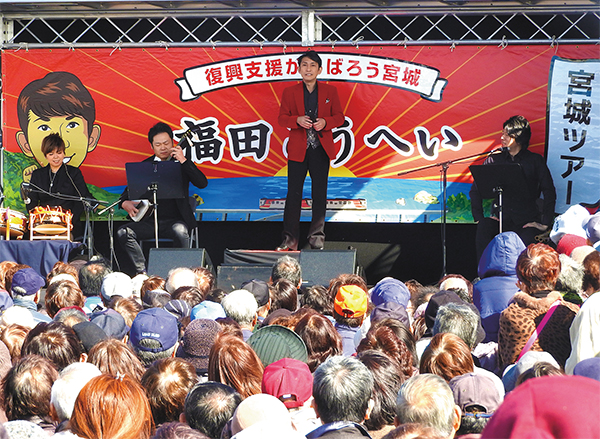 平成23年に起こった東日本大震災。交通手段も限られるなか、盛岡から三陸へ民謡の仲間たちと駆けつけたという、福田こうへいさん。自分にできることは何か─、それは民謡や演歌を歌って、皆を励ますこと。翌年のメジャーデビュー後も、自家発電機を積んだステージカーで、復興支援の無料コンサートを続けてきました。復興支援は、これからもライフワークとして続けていくと決めているそうです。